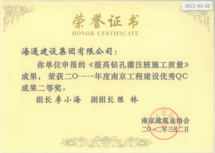 2011年度南京工程建設(shè)優(yōu)秀QC成果二等獎(jiǎng)