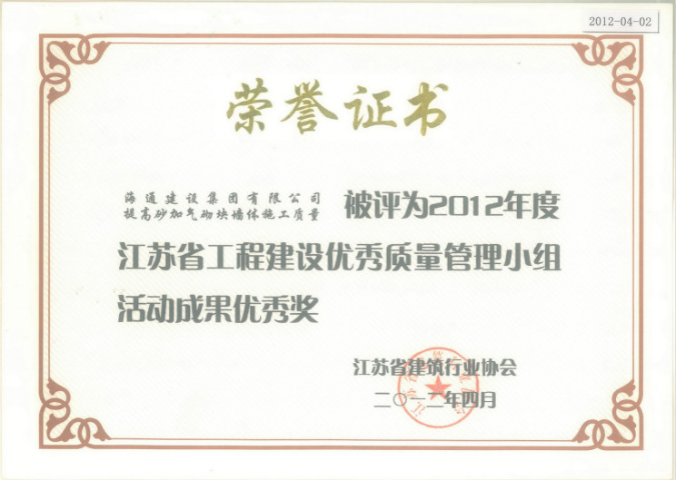 2012年度江蘇省工程建設(shè)優(yōu)秀質(zhì)量管理小組活動(dòng)成果優(yōu)秀獎(jiǎng)