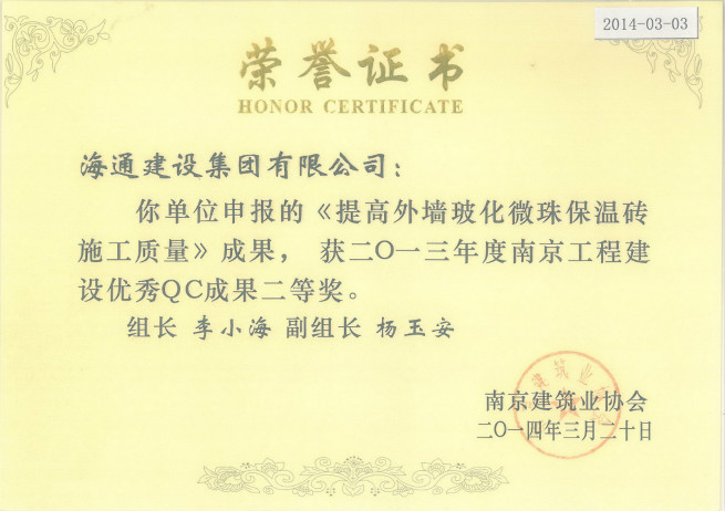 南京工程建設(shè)優(yōu)秀QC成果二等獎(jiǎng)