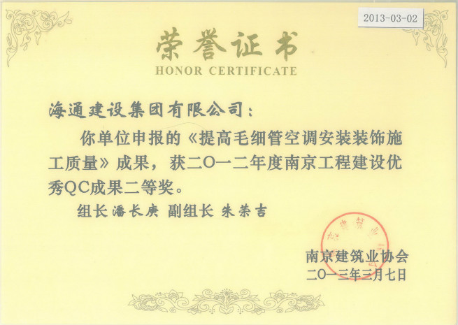 2012年啊度南京工程建設(shè)優(yōu)秀QC成果二等獎(jiǎng)