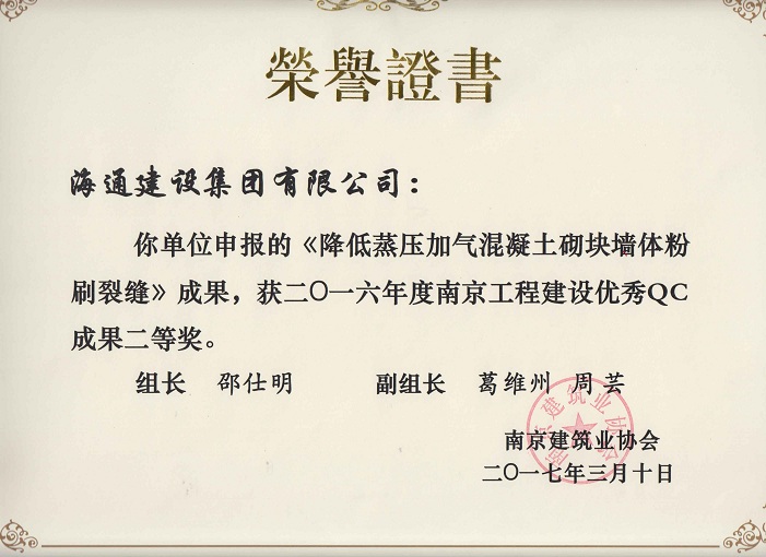 南京工程建設(shè)優(yōu)秀QC成果二等獎